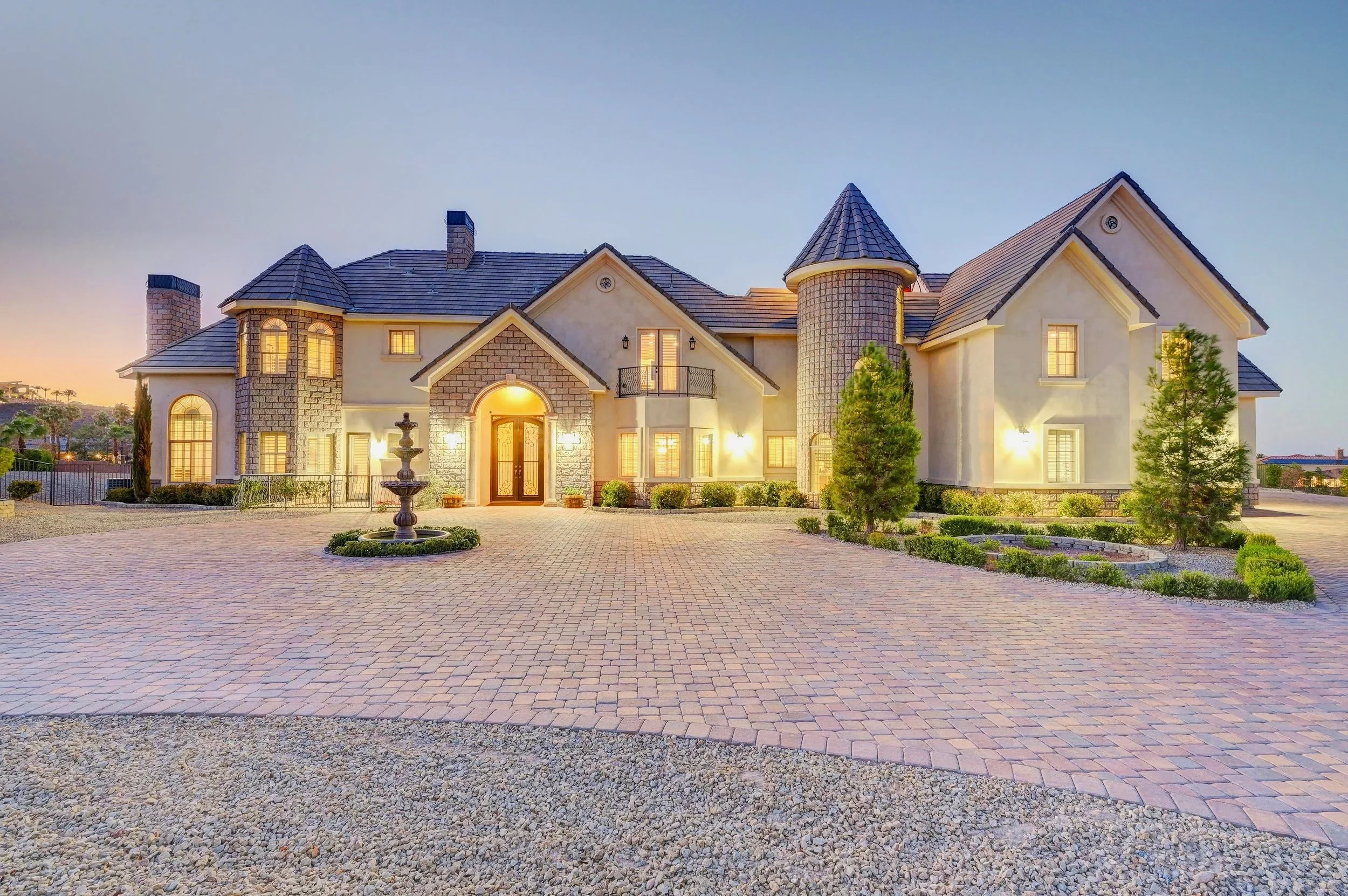 Grand entry foyer with soaring ceilings, fireplace, and sweeping staircase at The Castle luxury vacation rental in Henderson near Las Vegas